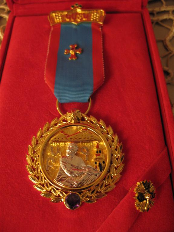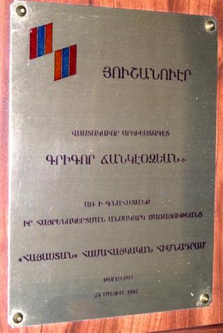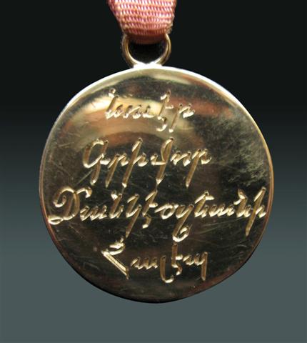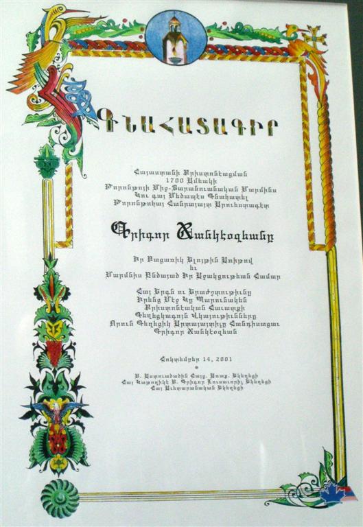 “Mesrob Mashdotz” gold medal of Armenian Catholicosate of Cilicia, given by His Holiness Aram I Catholicos (Beirut/Lebanon) and bestowed by Archbishop Khajag Hagopian (Toronto/Canada).